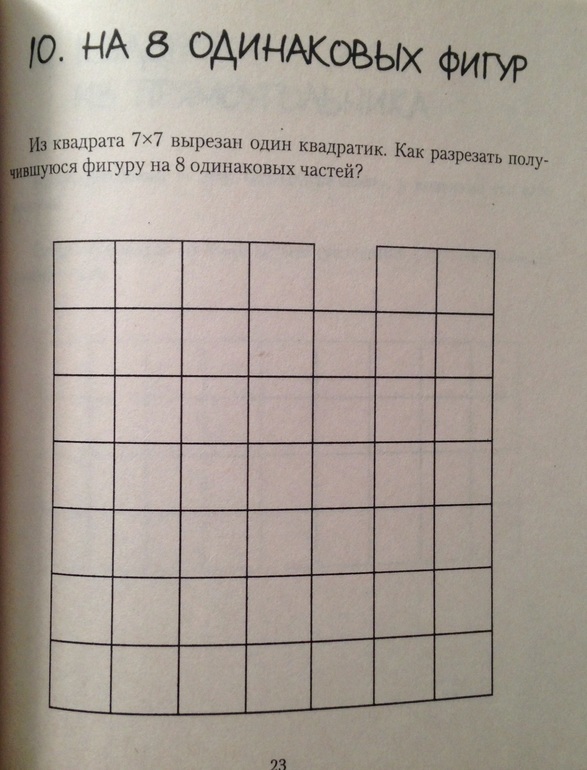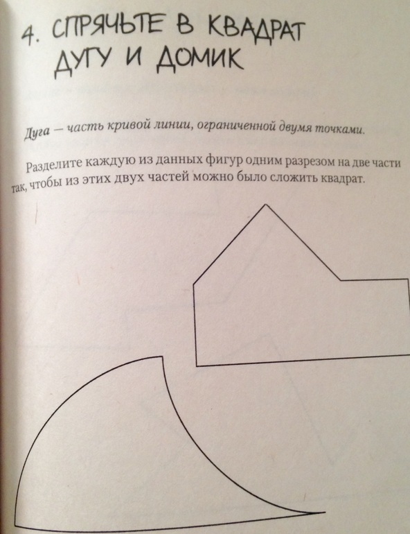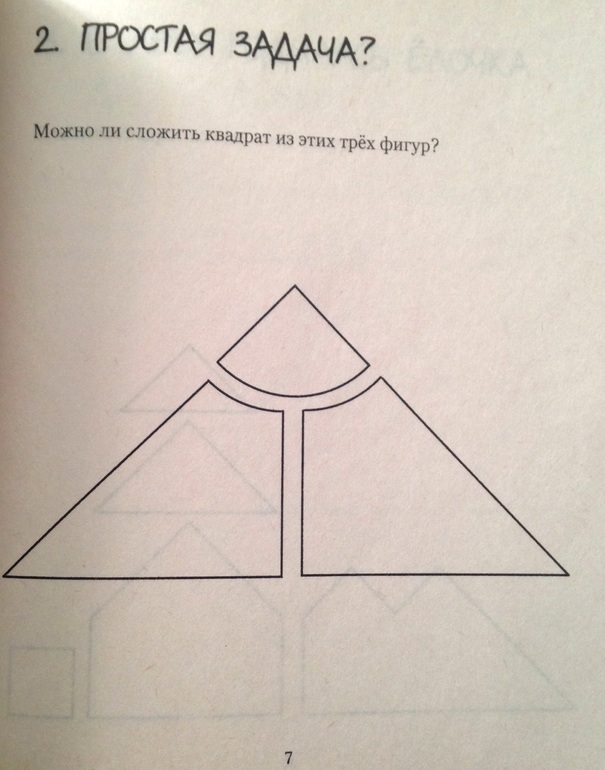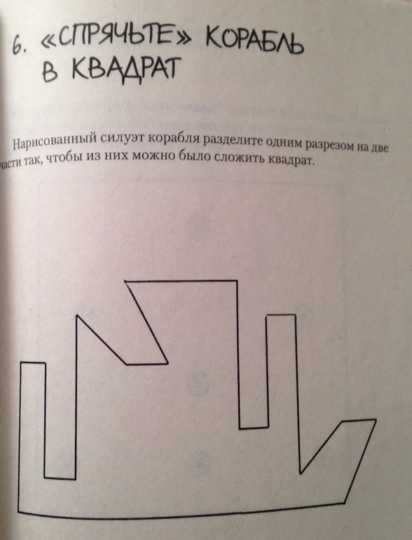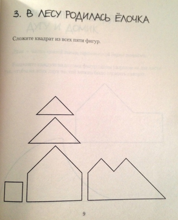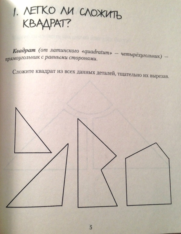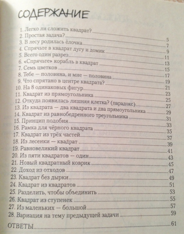 Задания располагаются от простых к сложным . Всегда требуется сложить квадрат из разных фигур или поделить квадрат на части определенным образом. Квадрат из прямоугольника, квадрат из трех частей, квадрат из лесенки, квадрат из квадратов.Простые задания похожи на известный танграмм, их всего три.Начиная с четвертого задания требуется подумать, как разрезать данные фигуры одним разрезом, чтобы сложить квадрат. Тут уже сразу у меня -взрослой не инженера мозг напрягся. Но интересно! С 8го задания просят поделить поровну фигуры, у некоторых не хватает заведомо части. Через каждые 3-4 тип задания меняется и усложняется. Всего их 28. В конце приводятся ответы.Каждое можно оформить в виде картонной заламинированной головоломки, изготавливая их по мере взросления ребенка.Нам доступны наверное только первые пять.