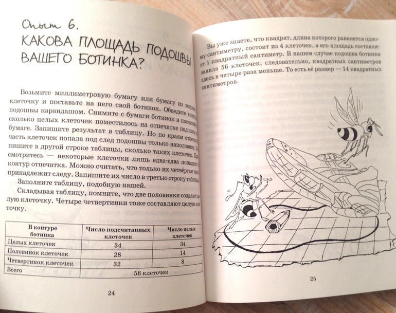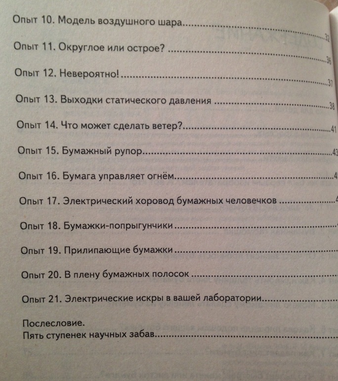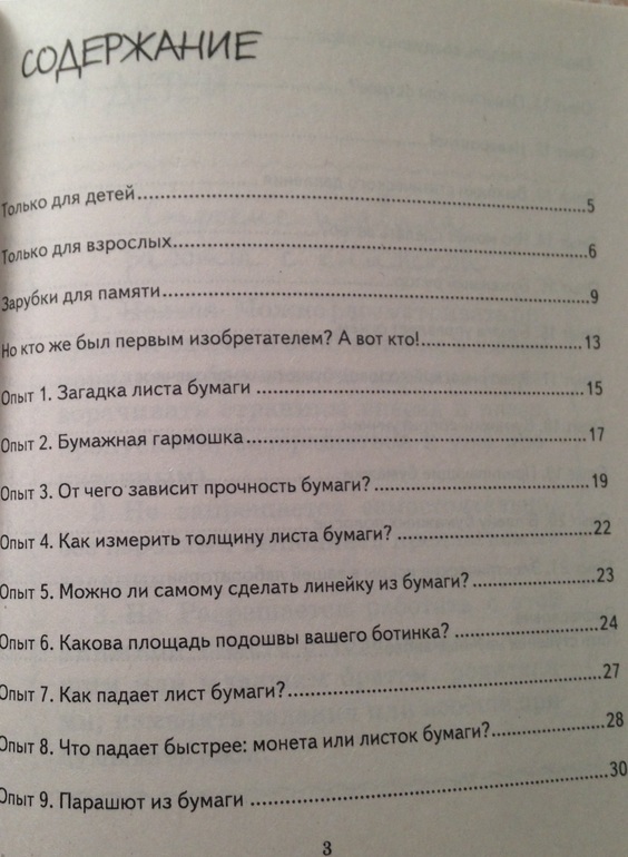 Здесь 21 опыт, для которых потребуются: тетрадные листы, альбомные листы, миллиметровая бумага, газеты, карандаш, пластилин, ручка, ножницы, клей, нити, шпильки, скрепки, мел,линейка, гребешок, ботинок, монеты, щетка для одежды, кусок стекла, шерстяная нить,консервная банка, керосиновая лампа, книжки разной толщины, вода и родители. Почти все простое, где брать керасиновую лампу не ясно. Но понятно, что она нужна для запуска воздушного шара, нагрева воздуха. Думаю, можно нагреть воздух без керасиновой лампы. Нагрев, поджег есть, все это делается под присмотром родителей конечно. Книга также реккомендуется на 5-6 летний возраст. В начале рассказывается об истории создании бумаги и возникновении письменности-собственно для чего бумагу и создали. Первый опят покажет свойства бумаги, заложенные на фабрике-направление волокон. Далее предлагается самим изменить свойства, сложив в гармошку и намочив. Затем проверка на прочность , и рассказ о том, как бумагу используют сейчас, что всегда рядом карандаш и линейка. Детям нужно самостоятельно сделать бумажную динейку, а затем измерить ей площадь ботинка. Следущее свойство бумаги-легкость изучается сравнением скорости падения , изготовлением парашюта, воздушного шара. Также бумага бывает округлая и острая, если её складывать. Может служить рупором,трубой. В конце несколько опытов со статическим электричеством.