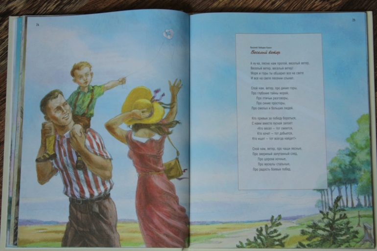 Сборник стихов и песен советской эпохи. Книга чуть меньше А4 формата - 27х21см, 96 страниц, бумага офсетная (не очень плотная). Шрифт не самый удобный для чтения :( Иллюстрации Анатолия Пустовита. Не скажу, что я от них в диком восторге, но отношение к ним ровное, даже больше положительное. Очень понравилось, что на иллюстрациях много неба, простора. От этого книга ещё светлее, ещё легче.