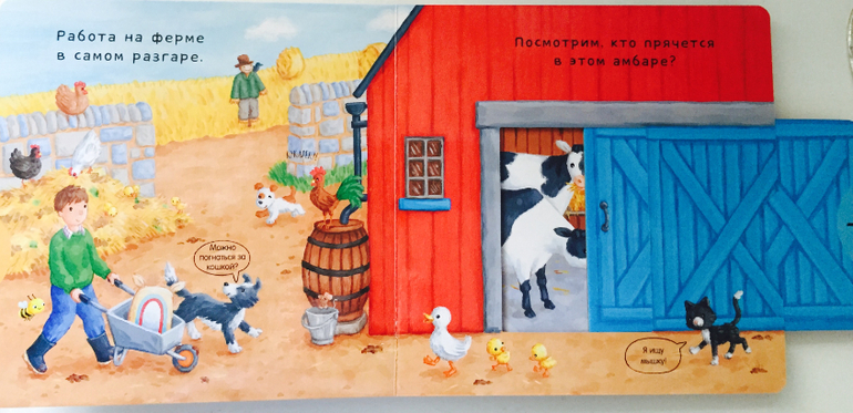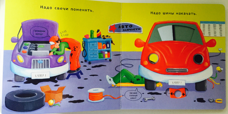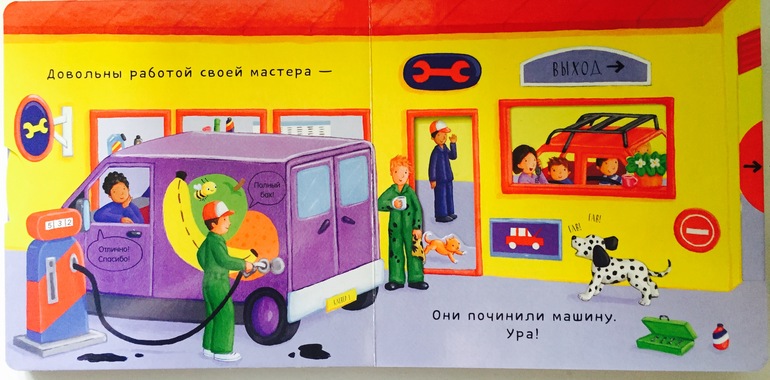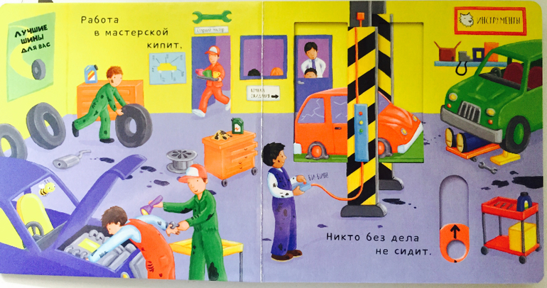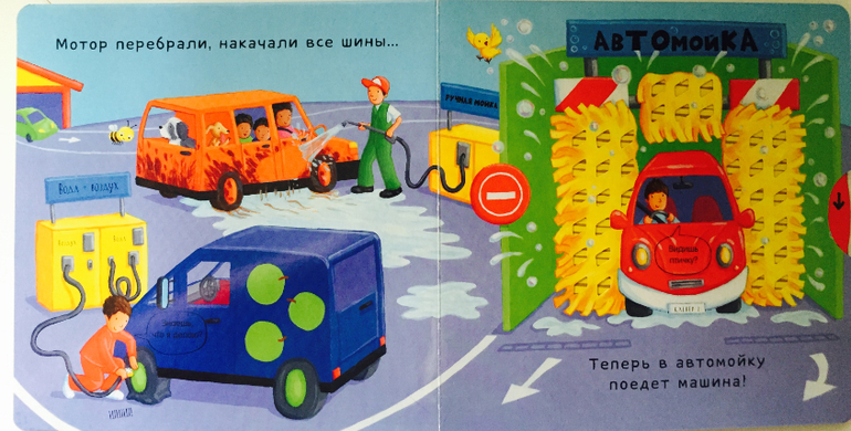 И последняя наша книжка из этой серии, которая очень пользуется спросом у сына это "В автомастерской". Он у меня очень любит все чинить, мыть грязное и рассматривать детальки, поэтому она и пошла на ура.