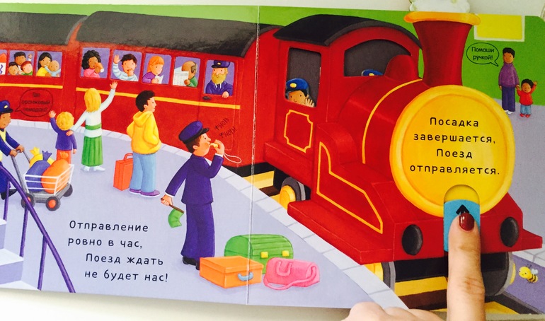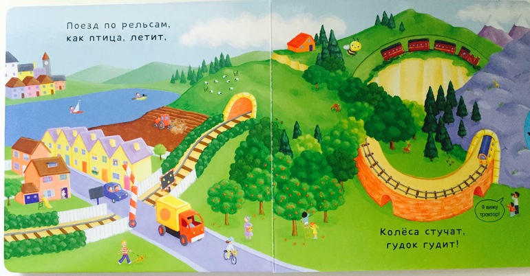 Во первых, в случае книги "На поезде" представлены ситуации: на вокзале от покупки билетов до посадки, следования поезда и даже правил дорожной безопасности. Мы используем ее как "гляделку" (я говорю Митюшке сможет ли он найти например, трактор в поле? и он с удовольствием просматривает рисунки и находит).