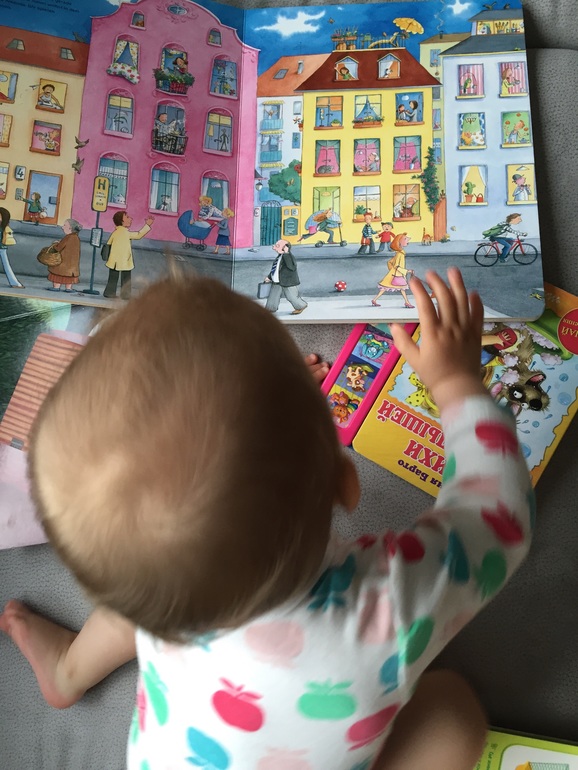 мы заказали родным, если что в подарок малышу, то русские книги. а так я на базар детский зарулила и взяла книжек, что с толстыми страницами и большими рисунками, мамочки часто продают. решила их на пол переместить как поползем, нет да нет, да доползем и заинтересует. еще не была тут в библиотеке, там тоже думаю есть что взять.