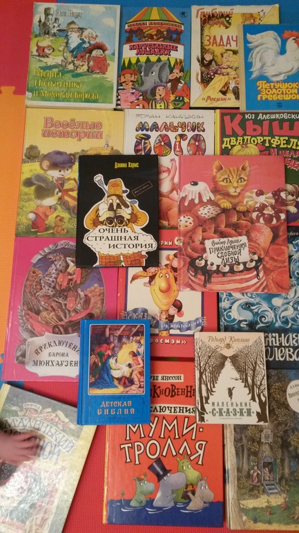 P.S. Мой начинающий читатель вошёл в такой ажиотаж от обилия книг, что фото удалось сделать только такое. Через 10 секунд я не досчиталась в кадре и детской библии, и Мюнхаузена:).
