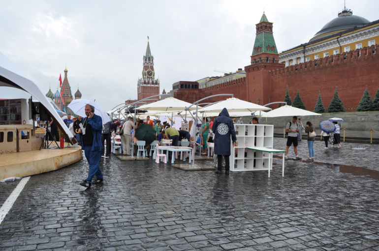 Утром был моросящий дождь. Луж не было(брусчатка+горка). Людей тоже почти не было. всех отпугнул дождь... я приехала к 11. на входе простояла 2 минуты. Толпы не наблюдалось нигде. Таааак жаль было организаторов МастерКлассов по глине(((( сидел 1!!! ребенок и лепил((( захотелось самой сесть. Дождик был моросящий и все было под зонтиками и совершенно сухо! Хотя утром говорили лило, как из ведра. Я полистала новинки, но брать ничего не стала. отправилась к регионам.