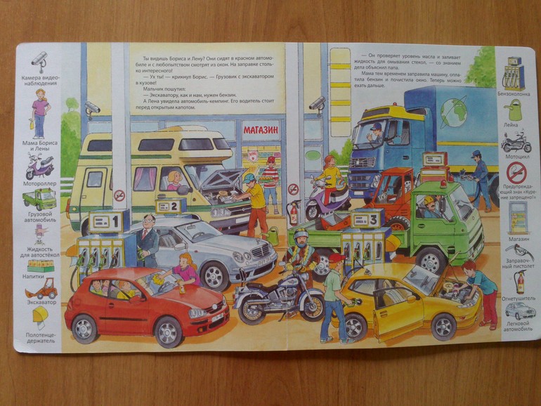 Текста в книжке совсем немного,но это и не страшно,потому что главными здесь являются иллюстрации.На каждом развороте отдельная тема.Герои рассказа - дети,Борис и Лена,путешествуют с родителями на автомобиле.Они узнают,что происходит на заправке,что бывает после аварии на дороге,чем занимаются механики в автомастерской и как выглядит автомойка и автосалон.