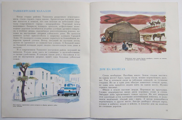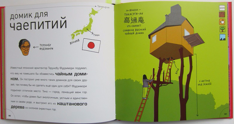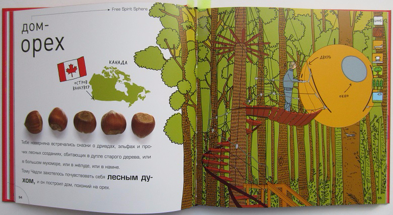 Один разворот посвящён одному виду жилища. Изображение не только внешнее, но и как выглядит дом внутри. Есть отметка на карте, где строятся именно такие жилища: