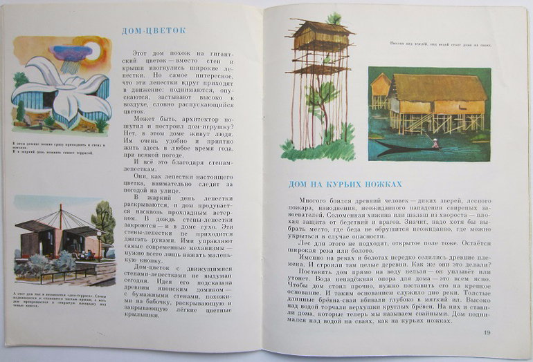 Больше внимания форме дома.Интересная глава о жилищах Средней Азии. Есть также о переносных домах и бумажных. Есть истории о "Доме-цветке", "Доме на курьих ножках", "Доме на сваях".Последний раздел "Завтра" посвящён идеям, которые приходили в головы архитекторам 80-х. Не все из них осуществились уже сейчас, но многие)