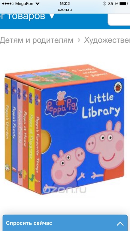 Расскажу вам какие бывают книги про Пеппу на английском, просто для информации. Лицензия на производство есть только у одного издательства- ladybirdЭто либо картонки. То, что вы в первой картинкой показали, там читать вообще нечего, там пару слов на странице. Другой вариант тонкая квадратная книга с 1 историей, стоят такие книги аж по 5 фунтов. В идеале купить сборник, где таких историй хотя бы 6, а стоит будут, как 2-3. Про наличие книг не отвечу, т.к. у нас в принципе туго с англоязычной литературой.