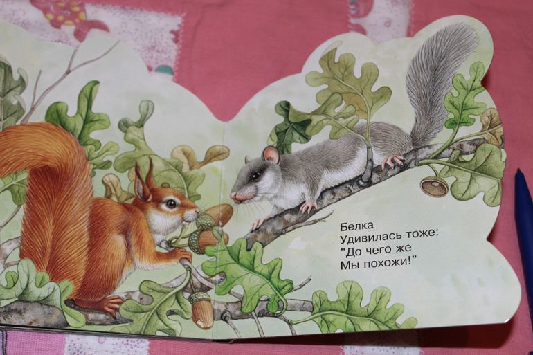 На эту книгу наткнулась случайно, очень заманили меня живые иллюстрации. Все животные, цветочки, ягодки все очень реалистичное. Очень смутил текст. У меня лично сложилось впечатление, что книгу сначала нарисовали, а потом уже под рисунки попытались состряпать какой-то текст. Не хватает каких-то дополнительных четверостиший между страницами, проговариваю сама словами, уже без рифмы.