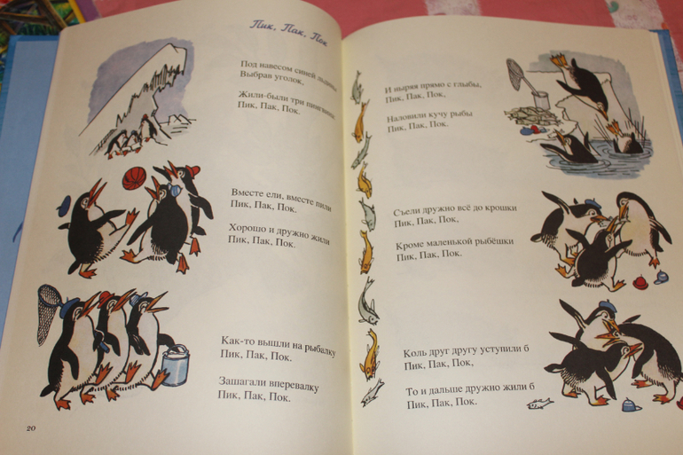 Надо сказать, что не смотря на заверения всех тех, чьи отзывы я читала, стих "Пик, пак, пок" непосредственно в книге дочь не особо зацепил, но ко мне он привязался буквально сразу же. Этот простой, легко запоминающийся стих постоянно вертелся в моей голове, ну и конечно же на языке, естественно получается что и на слуху у дочери. И моя, пока что мало что говорящая дочь, начала ходить и говорить "и-а-о". Очевидно, это в ее интерпритации "пик-пак-пок"))))