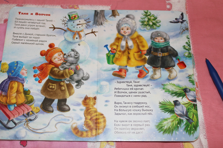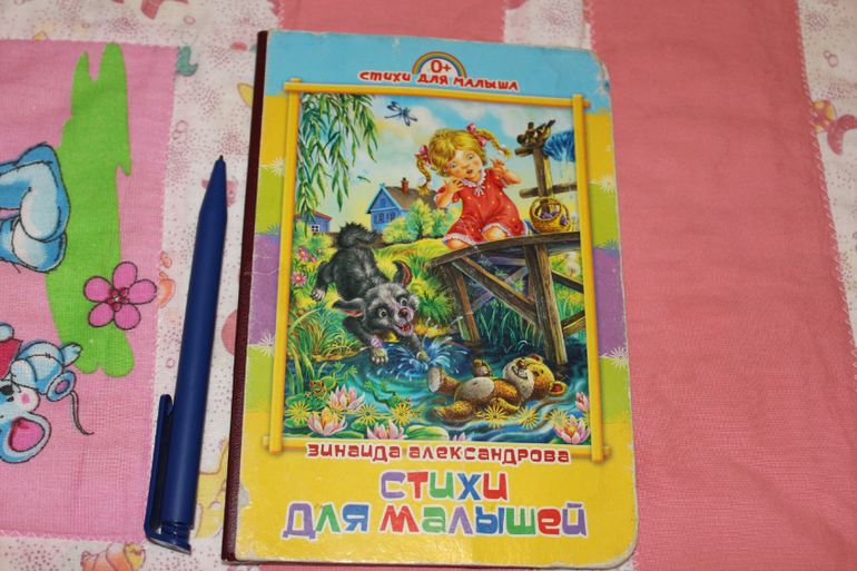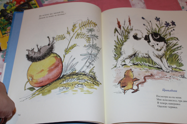 Эта книга была куплена одной из самых первых, Юле тогда еще и 6 месяцев не было, ну сами видите давно зачитана. Конечно, здесь много текста приходится на каждую страничку, по одной картинке на каждый стих. Но иллюстрации хорошие, настоящие, реалистичные.