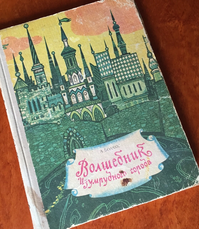 Узнав, что мы начали читать "Волшебника Изумрудного города", наш папа навестил свое родовое имение, порылся "в запасниках" и выудил на свет экземпляр "Волшебника", читанный им самим в детстве. Вот он какой, старенький, потрепанный, помнящий папу Олеси маленьким :)