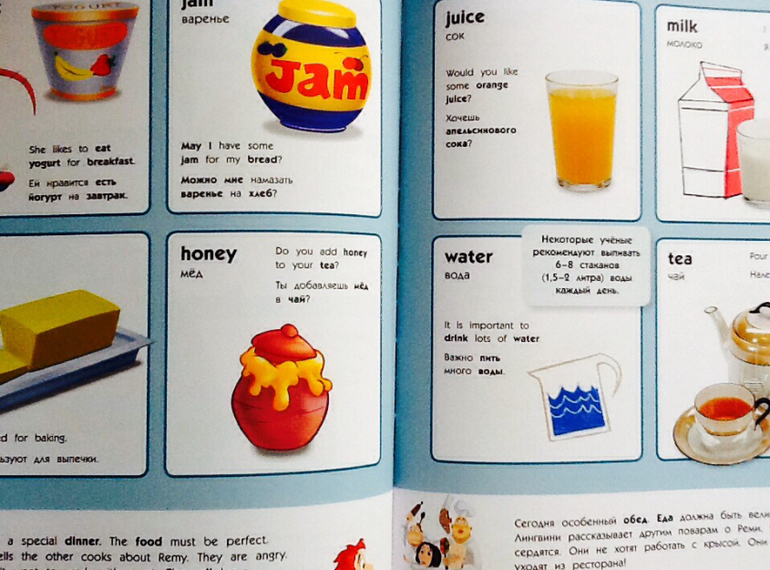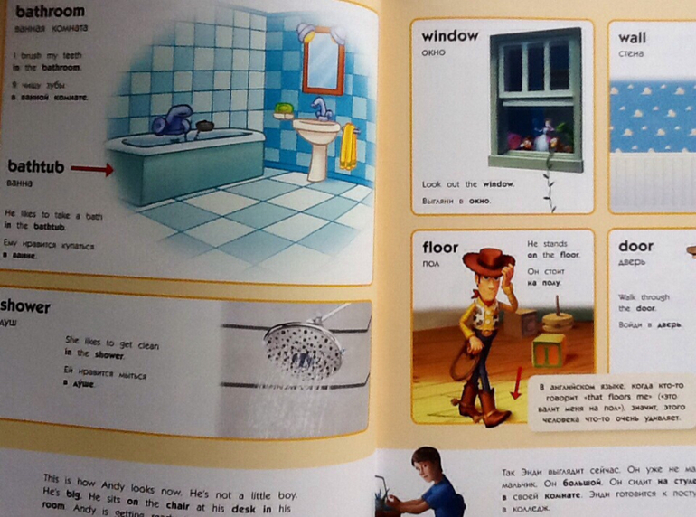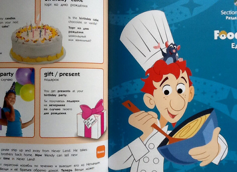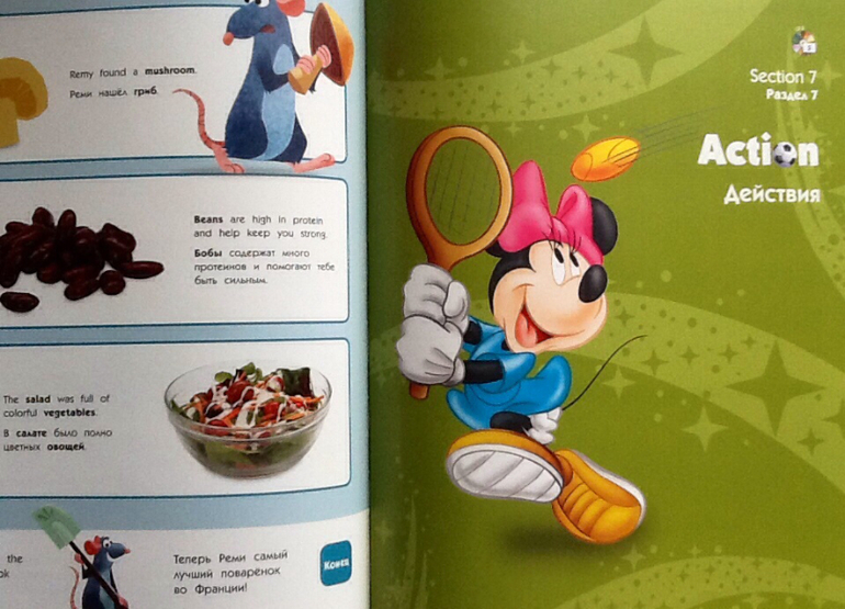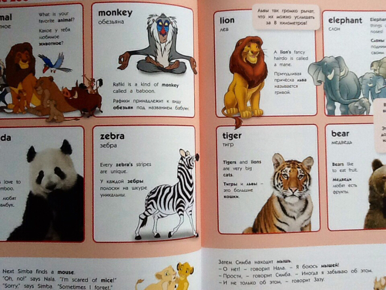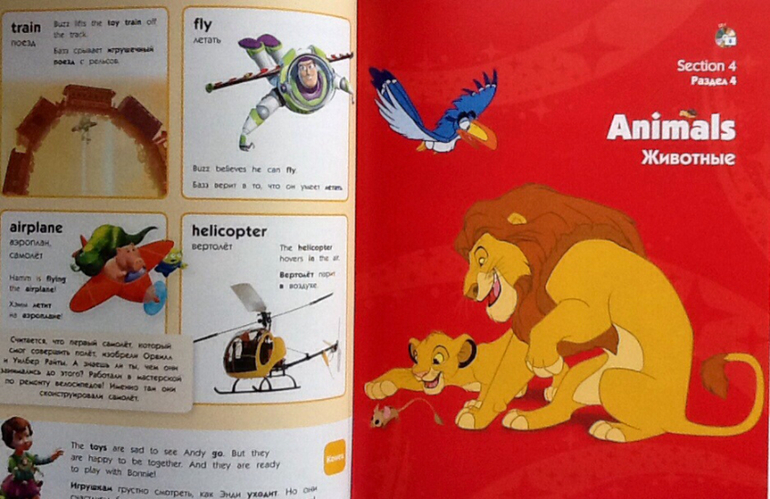 Например, раздел «Животные» сопровождают герои мультфильма «Король лев». В книге так же есть изображения реальных людей, животных и различных предметов.