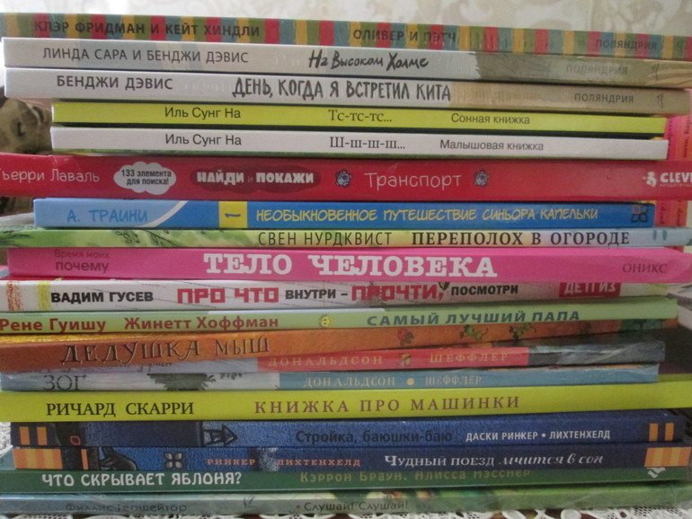 Поляндрию приобрели впервые. А такие, как Дональдсон и Нурдквист - в дополнение к уже многим имеющимся. Два подарочных набора от М-П: Карлхен из 7ми книг (одна оказалась с браком - 2 абсолютно одинаковых разворота) и все 10 историй для самых маленьких - очень нам понравились).