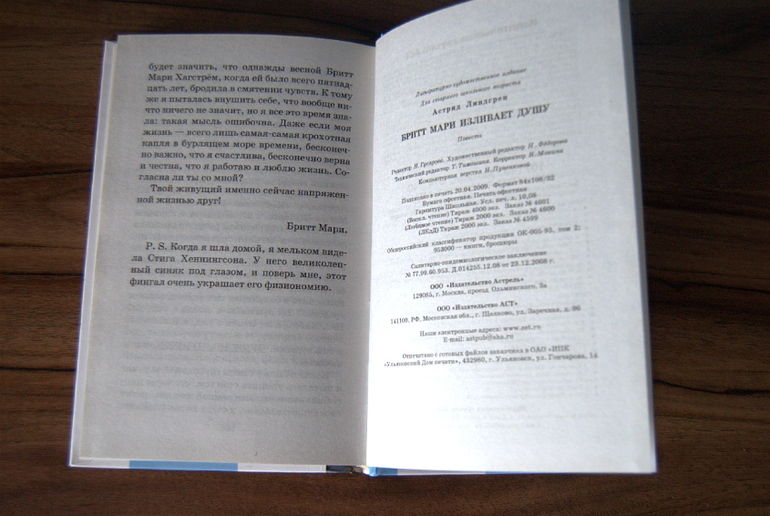 "Я люблю их [книги] не только читать, но и трогать, ощущать их, знать, что они мне принадлежат. Мама и папа считают, что есть такие книги, которые должны иметь все дети. Думаю было бы замечательно, если бы все родители придерживались таких взглядов, потому что... ой, сколько радостей выпало на нашу долю благодаря книгам, они у нас никогда не считались каким-то предметом роскоши, кучи книг всегда лежали в наших корзинках с рождественскими подарками, а в наши дни рождения - на столах с подарками. И тот, кто когда-нибудь женится на мне, должен отвечать двум условиям: любить книги и любить детей." - подозреваю именно в этом сообществе как никто могут понять и поддержать слова Линдгрен в лице Бритт Мари