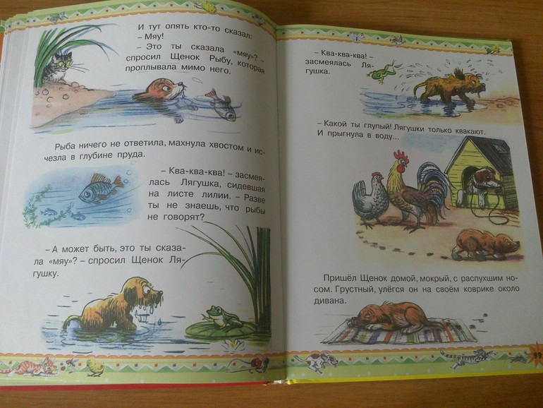 вопрос: А в Цыпленке и утенке Лягушка имеется?Обьясню... у нас дома накопилось 4 книжки данного произведения разных годов: энциклопедия для чтения в детском саду (какого-то мохнатого года);книжка-малышка (за 5 копеек) из моего детства;сказки для малышей (в наследство от старшего досталось)и приобрели в Лабиринте карманную книжку "Весёлые сказки и истории" (выбирала только по содержанию — чтобы побольше и по размеру (для маленьких ручонок)И что получилось? во всех 4х изданиях — текст отличается!!!! (Это я про Цыпленка и Утенка)-где-то Утенок не предлагает дружбу;-где-то нет Лягушки! (сразу после бабочки они идут купаться)-да, а где с Лягушкой тоже варианты перевода текста "Я вижу Лягушку...." "я не боюсь Лягушку...."-а где-то нет Буль-буль- сказал Цыпленок...В общем, авторство Сутеева в различных изданиях.... эх-ма