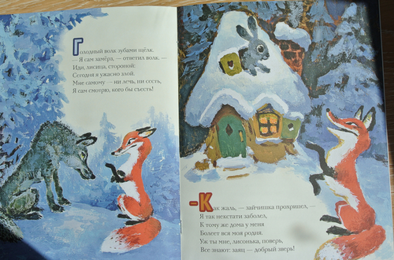 А сюжет... Сюжет по ходу чтения меня держал в интриге. Сначала я думала, что зайца лиса проведет и как из лубяной избушки выкинет. Потом, думала, собака лису потаскает знатно за хвост. А оказалось намного душевнее. Это же "Груффало", подумала я:))) У лисы вдруг резко поменялись планы. И совсем она не замерзла: