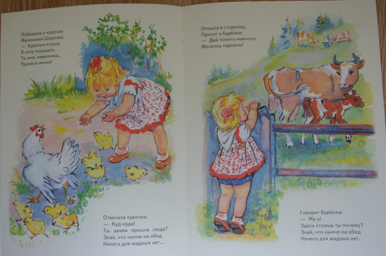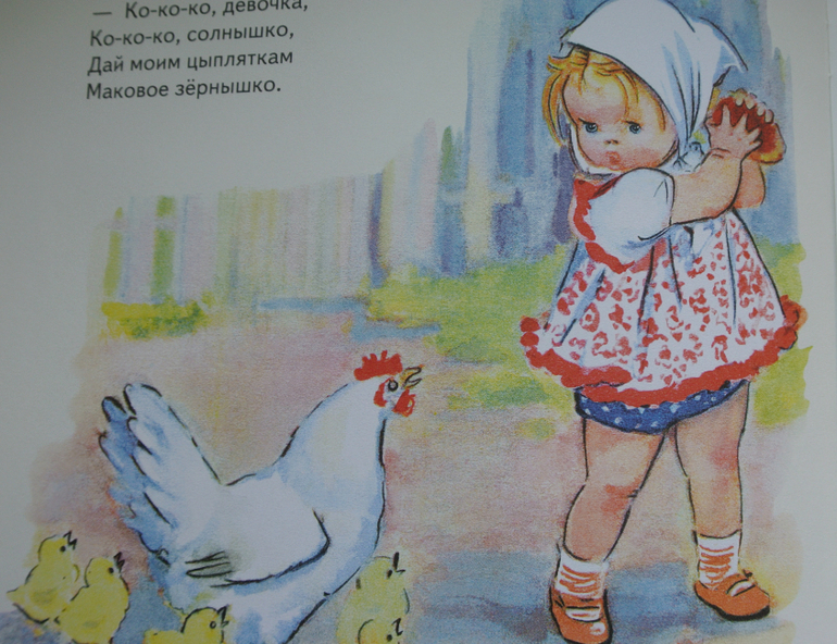 Да-да, здесь речь о жадной девочке, которая не поделилась своей маковой булочкой с деревенскими соседями. Зато когда сама захотела кушать и побежала просить у курочки-невелички яйцо, у Буренки и козочки молока, те так прямым текстом ей и ответили: