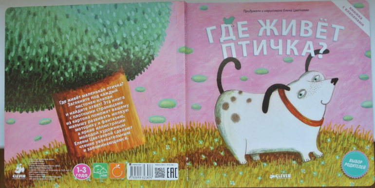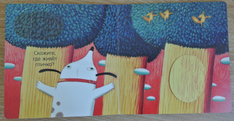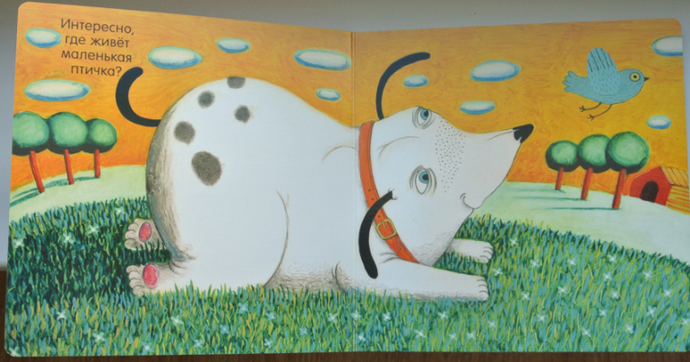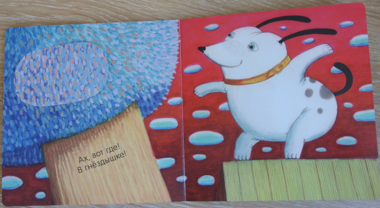 Прошу прощения за огромное предисловие. Это все веду к тому, что собака и птица в книге, плотный картон, да еще открывающиеся клапаны в книжке - беспроигрышный вариант для нас.