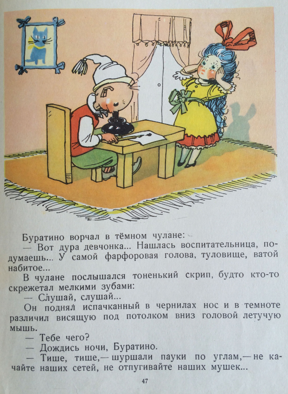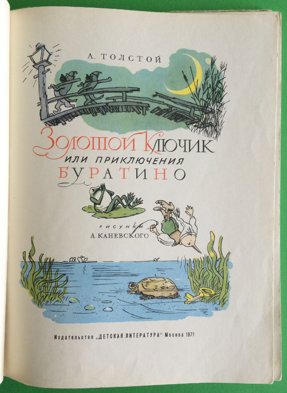 Нет-нет-нет, не пугайтесь, это не попытка прыгнуть выше головы и раньше времени. Собственно, книга даже не предлагалась и не собиралась предлагаться, но... всегда присутствует некое волшебное "но" для неожиданных книг. Сейчас это любимая песенка про Буратино, затем к пущему восторгу малышки показали ей как делать "длинный нос" растопыренными руками и всё, любовь ребятёнка к этому деревянномучудовищучеловечку готова. Пришлось поискать в закромах старую книжку, подаренную еще моей маме в детстве. Картинки я всегда любила, а вот саму сказку не очень. Потому и про Пиноккио прочитала сравнительно недавно - месяца 1,5 назад, с шикарными иллюстрациями, которые запали в душу, но сама сказка не понравилась. Наш Буратино лучше.