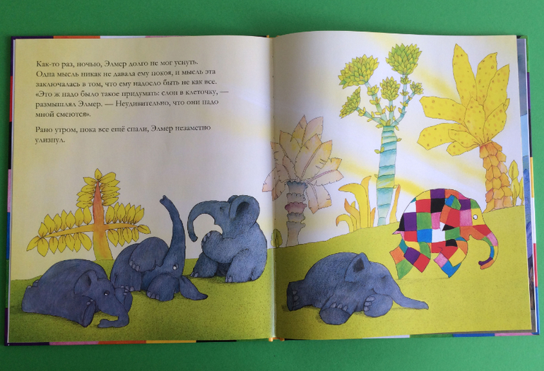 Первая и последняя наша книга про Элмера, в ней происходит знакомство маленького читателя с необычным слоном. Книга чудесна! Я рада, что в нашей библиотеке появился Элмер. Нет, правда, ее стоит показать ребенку - про цвета, про необычность и непохожесть на других и горести и страхи от того, сам текст достаточно прост и интересен маленьким. Но остальные книги про чудесного слона не вызывают желания бежать сломя голову за ними. Бывает и так, хотя очень люблю собирать сериями.