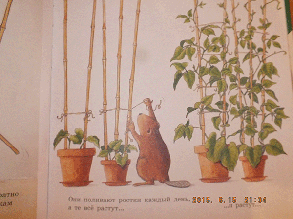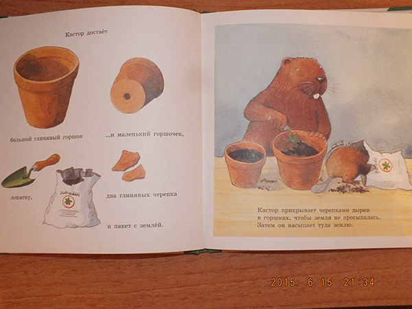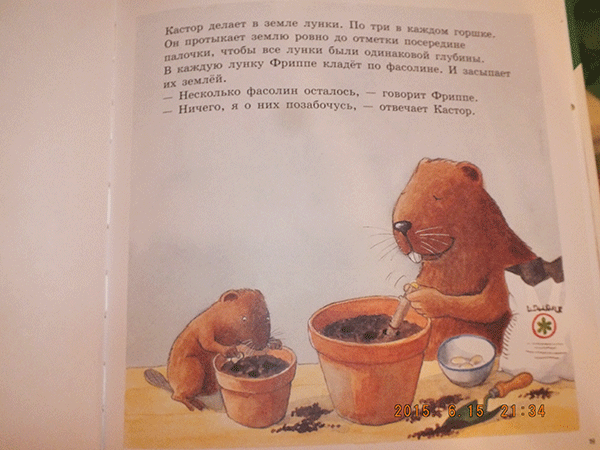В книге очень простая история. У Кастора на окне завял цветок, понятная картина. И он решил что-то посадить. На глаза попалась фасоль, ее то Кастор и решил прорастить. Фасоль выросла, потом ее сварили и съели. Вот и все. Ничего замысловатого. Но как сына замкнуло! В общем, фасоль мы посадили, ждем всходов. Каждый день сажает фасолинки в песок и потом варит из них суп.