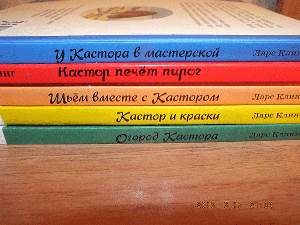 Самое яркое впечатление ребенка - это Кастор. Честно, думала я, что из этих книжечек про бобра мы выросли. Уж очень просты. Я даже отдала наши книги почитать нашему братику. И вот, когда нам их вернули (да еще с парочкой новых, тоже почитать дали), то ребенок только и хочет, что читать про Кастора. И пирог то мы пекли вместе с "Кастор печет пирог", все ремонтировали подряд вместе с "У Кастора в мастерской". Теперь дело дошло до красок и огорода. К шитью ребенок не проникся.