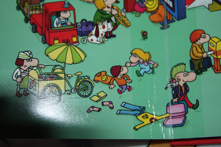 Дальше под руку попалась книжка-гляделка, любимый дочкин эпизод с панком, который, значит, "сипь-сипь", рассыпал, то есть, вещи. Я уже столько раз его видела, что точно знаю, что тут есть полосатые носки и полосатая продавщица мороженого под полосатым зонтом.