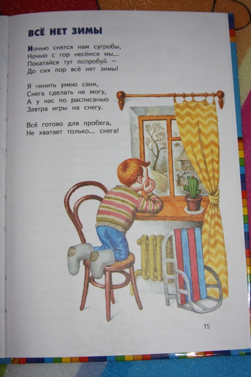 И для контрасту - полосатый мальчик с полосатыми санками, без яблок, зато с кактусом! И смотрит он вполне возможно как раз на яблони :) (Сборник Барто)