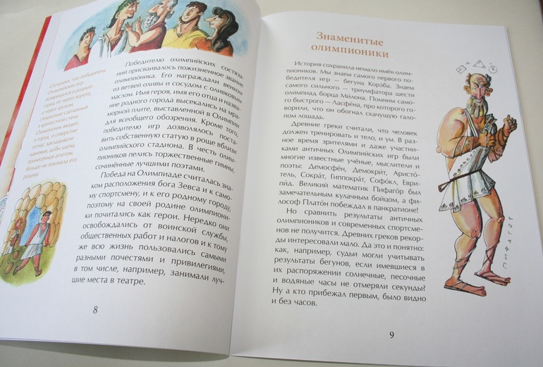 А Вы знали, что поначалу в Олимпийских играх принимали участие только атлеты из Элиды и близлежащих городов, что первые олимпийцы соревновались исключительно в беге и что в Олимпийских играх участвовали даже ученые. Математик Пифагор был отличным кулачным бойцом. Книга Олимпийские игры - кладезь полезной и интересной информации об олимпийских играх с начала их появления и до наших дней. Прочитав эту книгу, Ваш ребенок узнает, где и когда появились Олимпийские игры, кто мог принимать участие в этих играх, что в Древней Греции для кулачного боя атлеты обматывали кулаки кожаными ремнями с металлическими шишками. Книга была интересна не только моим детям, но и всей семье. Я узнала много нового об Олимпийских играх, их забвении и возрождении, о марафонском забеге.![]()