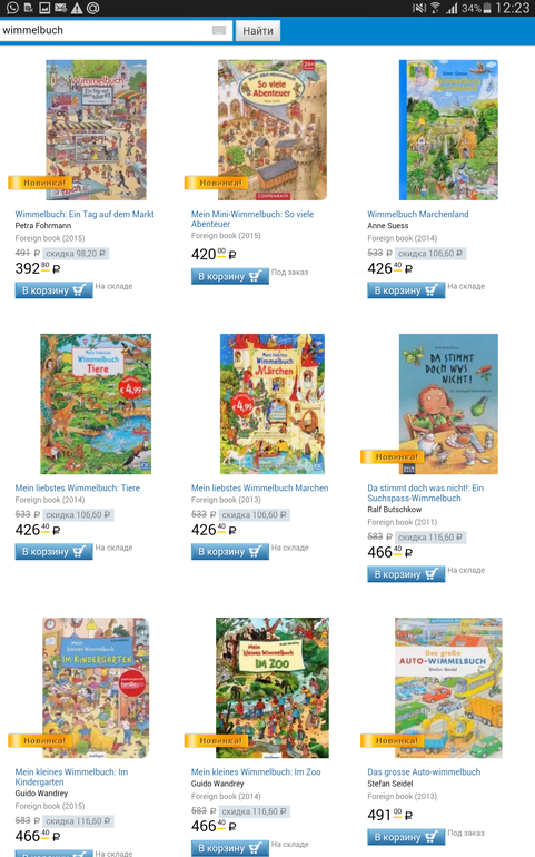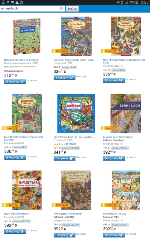 Я покупаю периодически виммельбухи на Озоне. У нас есть 3 со 2го фото и 2 с третьего. Весной покупала дороже. Единственное, я покупаю всегда со статусом "под заказ" и они всегда приходили новые. Один единственный раз взяла со скидкой со статусом "на складе", он пришел с браком - поцарапанной обложкой. Возможно просто совпадение. Мне довольно привлекательными кажутся цены, я дешевле не видела в этом году немецких виммелей