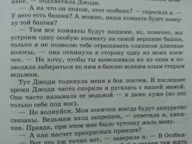 "Тут Джоди толкнула меня в бок локтем. В последнее время Джоди часто спорила и ругалась с нашей мамой. Она часто называела ее ведьмой - и даже хуже...." (стр. 7)