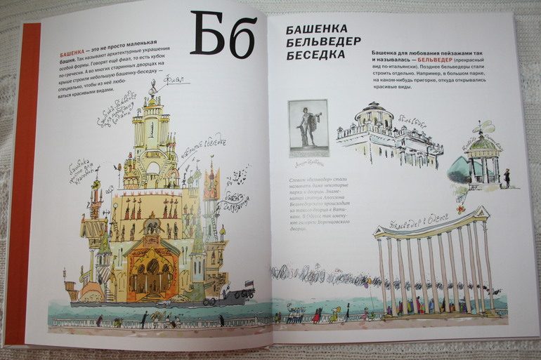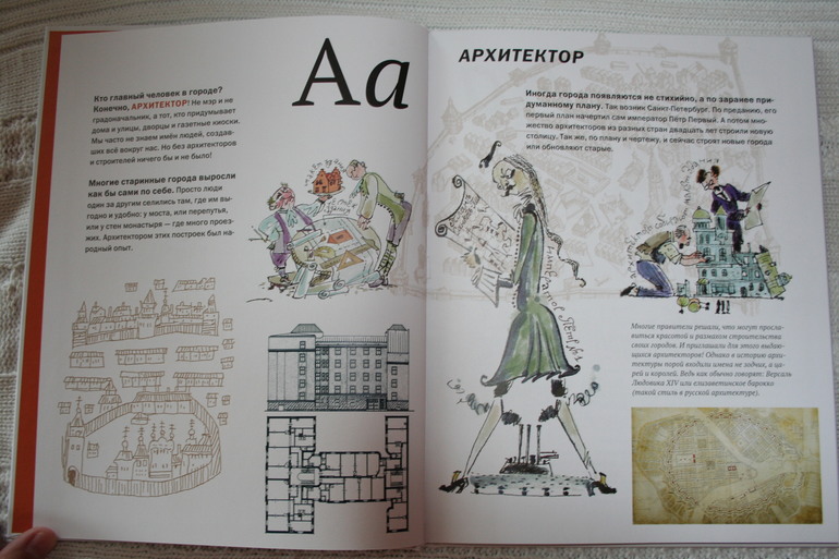средним школьникамНастоящая азбука про город. Буква М - метро, мост, буква Б - башенка, бельведер, беседка. Авторы книги приглашают нас на увлекательную прогулку по городу. Прочитав книгу, ребенок узнает, как были утроены российские и древнерусские города в разные времена, чем питались горожане, на чем передвигались, в каких домах жили, как работали фонари в городе и когда появились. Познакомится с такими понятиями, как бельведер, ротонда, хоромы, виадук. Также можно узнать и про современные достижения человечества - про метро, небоскребы, инженерные сооружения. К примеру, Вы узнаете, что в старину дворники были довольно важными персонами, они следили не только за чистотой, но и за порядком, что арку изобрели не римляне, а архитекторы Древнего Востока. Текст написан понятным и доступным для школьника языком. Книга рекомендуется для детей старше 6 лет. Книга большого формата в твердой матовой обложке, шрифт крупный, бумага мелованная, запоминающиеся иллюстрации Капыча отличносочетаются с текстом и помогают ребенку понять, как выглядят аркада, особняк или гостиный двор. Книга прекрасно подходит и для семейного прочтения и для самостоятельного изучения детьми. После ее прочтения можно отправиться с детьми в путешествие по своему городу и поискать старые купеческие особняки, ротонды, украшенные розетками, бельведеры и другие сооружения.