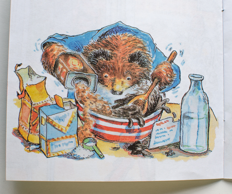 Паддингтон готовит сюрприз к возвращению миссис Браун и миссис Бёрд, он печет шоколадный торт (закончилось все, как известно, большой уборкой). "Медвежонок Паддингтон один дома", художник Р. В. Элли.