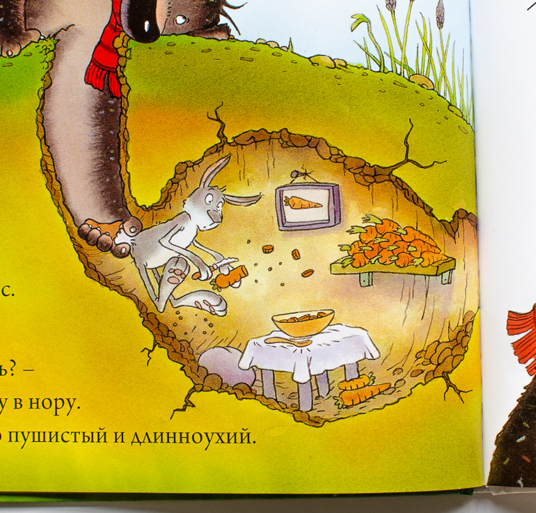 Кролик в своей норке как раз нарезал морковку для салата, когда до него добрался голодный до обнимашек Дуглас. Дэвид Меллинг "С кем обняться медвежонку?"