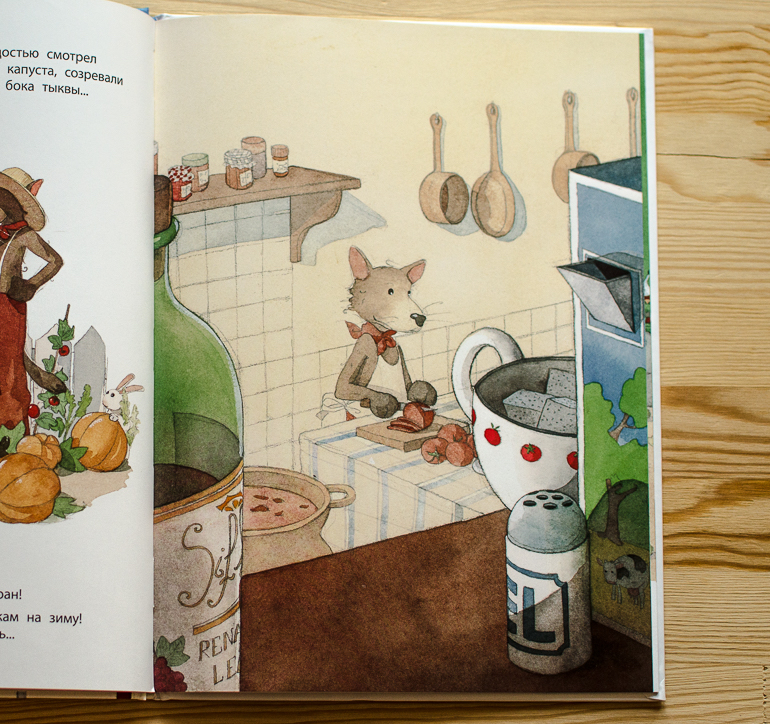 Незаметно прокрадемся на кухню к волку. Никаких мясных блюд, серый делает овощные заготовки на зиму! Художник Квентин Гребан, "Что у волка на обед".