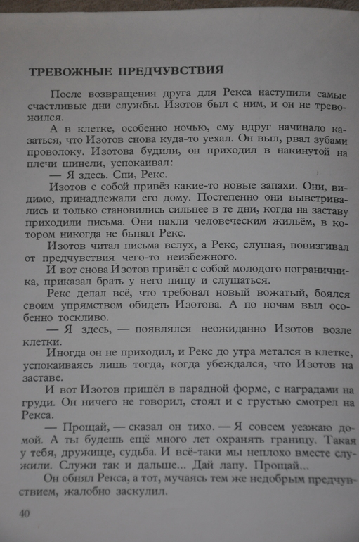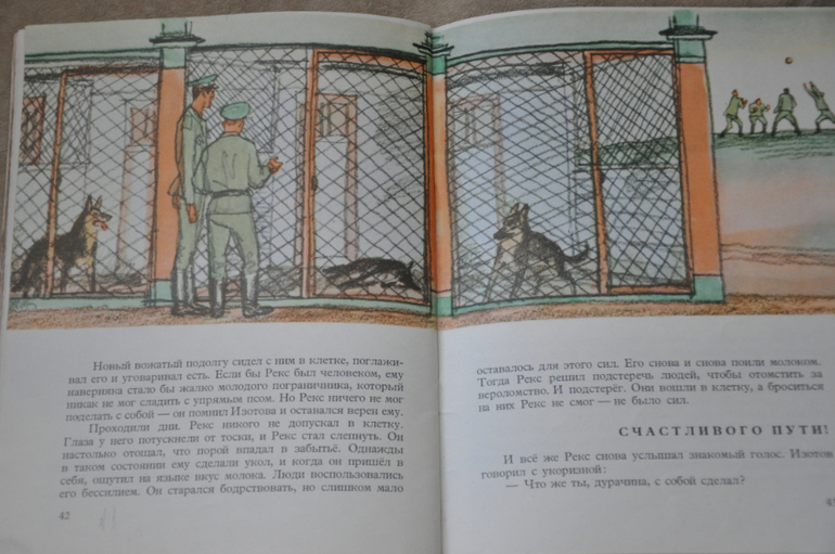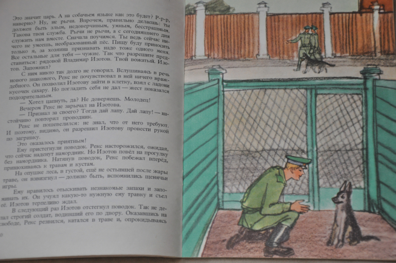 Совсем недавно один хороший человек дал мне возможность выбрать и забрать книги его детства. И вот одна из них так приглянулась сыну (да и мне), что уже два дня подряд, утром, днем и вечером мы читаем ее полностью. Думала книжка на попозже. Но решила почитать только начало книги - там идет речь про щенка Рекса, его становление в роли пограничной собаки и о дружбе с пограничником, инструктором и другом Рекса - Изотовым.
