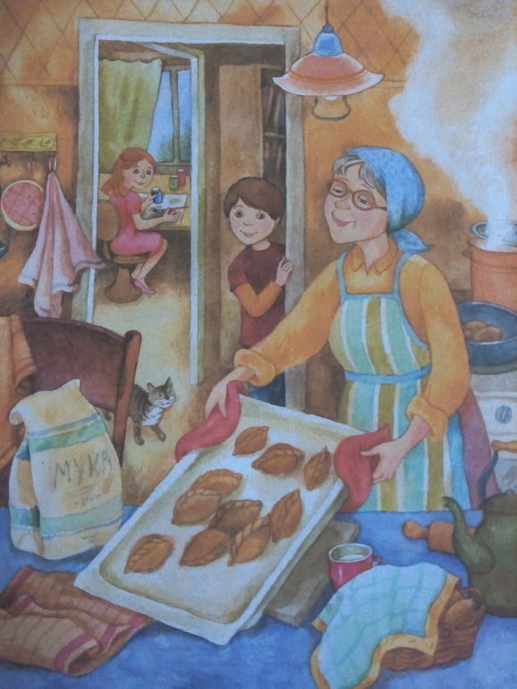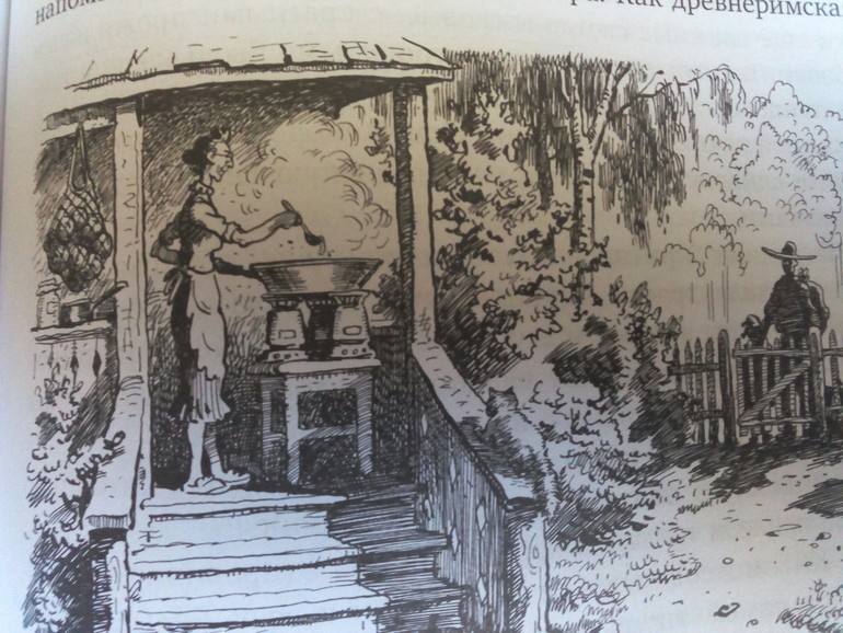 Очень люблю описания еды у С.Голицына. Приготовление пойманного сома, рецепт варенья из крыжовника, а что стоит неудачный компото-макаронный ужин у туристов-пионеров ? Единственная картинка с готовкой из книги "Сорок изыскателей", где Магдалина Харитоновна варит варенье.