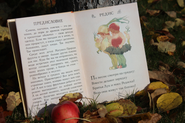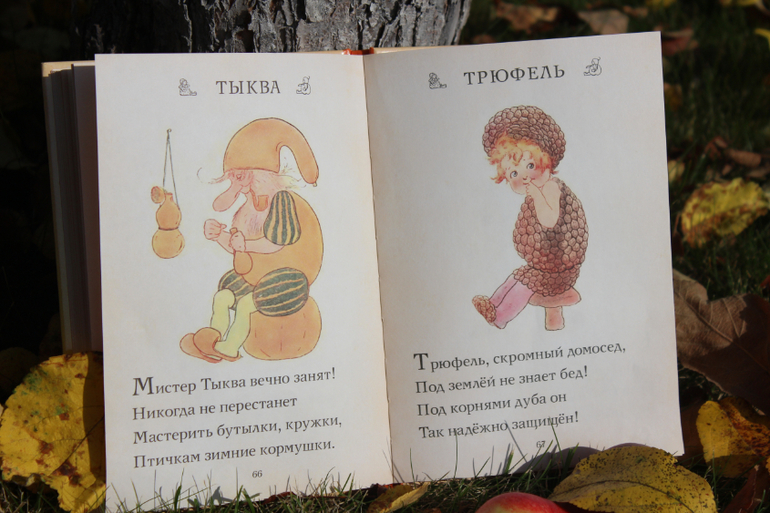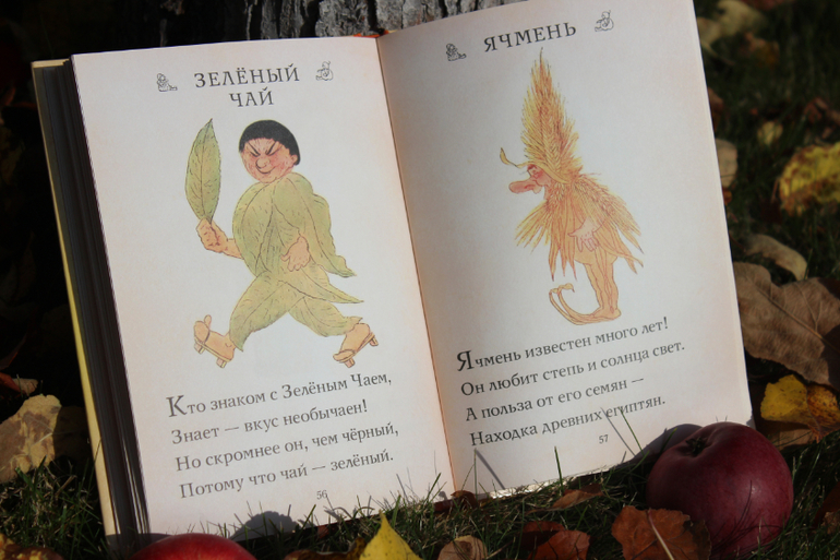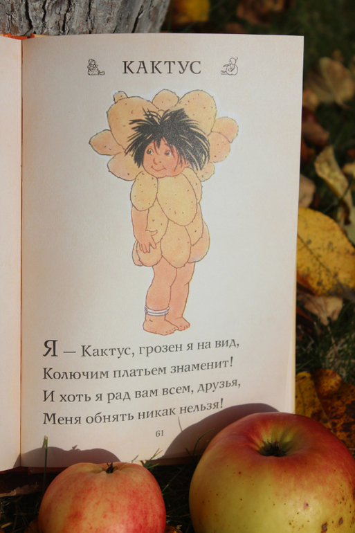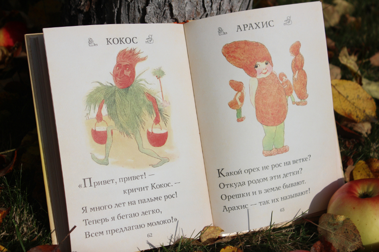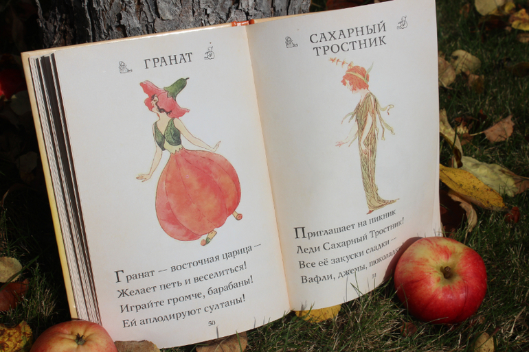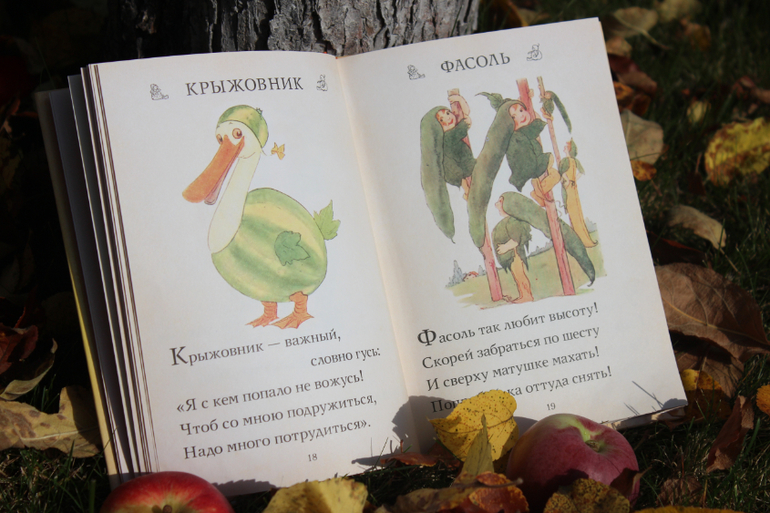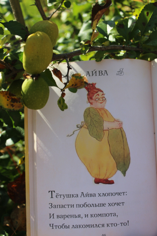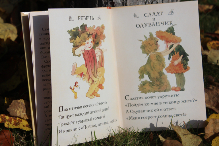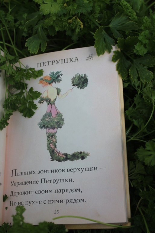 Книга не только об овощах и фруктах, есть стихи про грибы, ягоды, злаки, орехи, пряные травы и даже поп-корн, хлопок и кактус. Из каждого четверостишия малыш узнает что-то новое - новые названия, условия произрастания (салат растёт в теплице, одуванчик - на улице); что грибы нужно искать, они ведь хорошо прячутся; шпинат сочно-зелёного цвета; репа крепко сидит в земле; черника полезна для зрения; у цикория мы используем корень (Вика знает, что из него делают детский кофе); рис любит воду; из смородины мы делаем морс и компот; из полезной и красивой итальянской оливы готовят масло; в повидле и компоте мы можем найти сливу; чеснока в блюдо нужно класть совсем чуть-чуть; а у картошки, оказывается, есть сладкий южный брат - батат; из хлопка делают одежду и т.д. Непривычно,конечно,читать "миссис Хрен" или "Леди Сахарный тростник", для нас они мужского рода,но это быстро проходит :)
