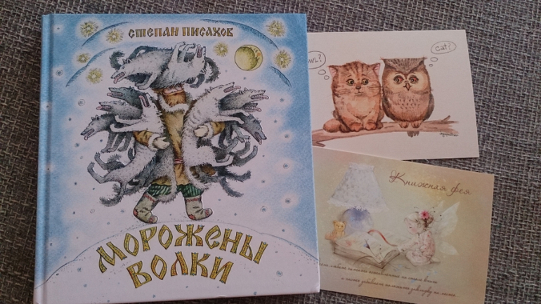 Приз, который мы выиграли в недавнем конкурсе! "Морожены волки" с иллюстрациями и подписью Елены Базановой. Плюс бонус - пару открыток!