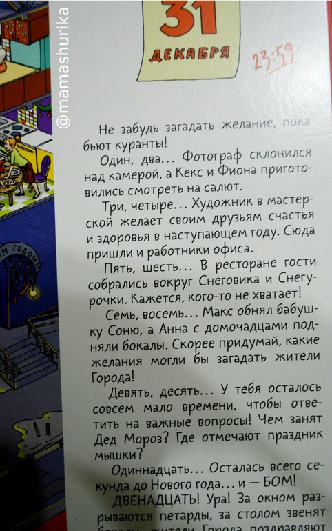 А ещё в книге есть Дед Мороз, за которым интересно будет наблюдать на каждой страничке, будет тут и праздничный салют и корпоративы и детские праздники, а закончится книга утром первого января, все спят, на улицах тишина, горы немытой посуды в раковине, повсюду остатки фейерверков, мишуры, конфетти в общем очень жизненно:))