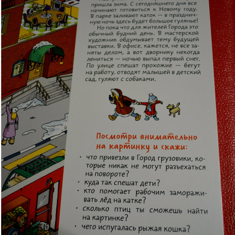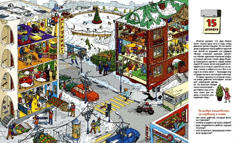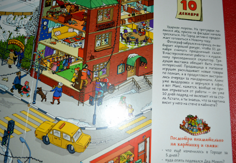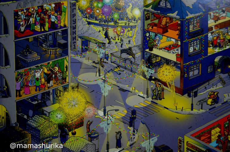 Плюс этой книги ещё и в том что тут есть текст, в отличии от иностранных виммельбухов, т.е. если вам сложно что то придумать, текст подсказка вам поможет,а ещё тут есть задания- найти какие то предметы, людей, в общем интересно очень!