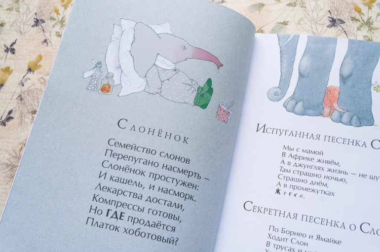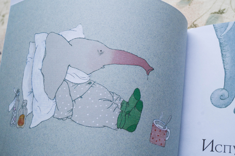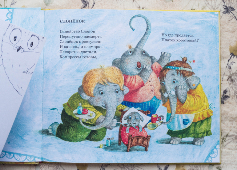 У Антоненкова Алиске нравится семейство. Есть бабушка, мама и папа. Они смешные. А мне не нравится слонёнок. Какой-то он уж совсем болезный, будто проблемы не от простуды, а прямо с рождения.