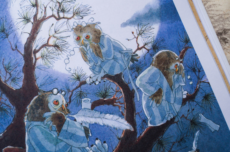 Антоненков лаконичнее и крупнее. Но какой образ, какой колорит! И, конечно, задорный привет от художника в виде банданы. Озорная сова, так и слышу из её уст пару скабрёзных лимериков!