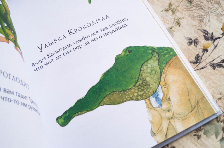 крокодилова улыбка и правда -наркоманская))))) И сколько мелочей в рисунках у Антоненкова, то задняя часть зайца в красных трусах, улепетывающая от улыбки крокодила, то таракан с ноутом от "Эпл" (правда, вместо яблочка -груша, это заметила старшая дочка), то песок, сыпящийся с верблюда и много-много чего!!!