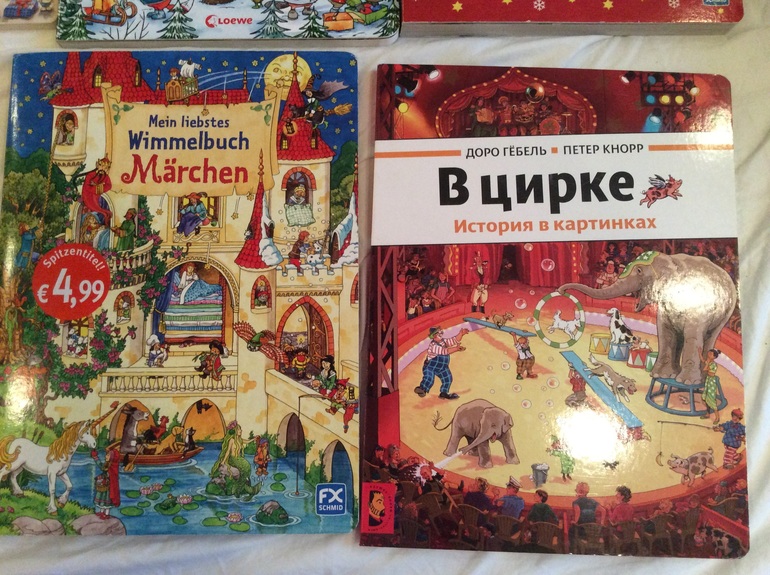 У меня вопрос / Дайте совет /Помогите выкупитьВсем привет! Помогите пожалуйста советом! Муж в ноябре едет в Германию, и я конечно же первым делом подумала, что бы нам оттуда нужно?) Конечно виммельбух! Что ещё везти из Германии?! У нас пока только Зимняя книга, дочка (3,2 года) недавно воспылала к ней любовью, поэтому серию докупать будем. Немецких виммельбухов великое множество, глаза разбежались! Но чемодан у мужа, как кстати и кошелёк, не резиновый) поэтому посоветуйте самые-самые книжки-глядели пожалуйста! Немецкий я не знаю, поэтому желательно минимум подписей, а лучше совсем без них. И ещё, муж будет в Гмабурге один-два дня и в Дюссельдорфе, может кто-нибудь посоветует крупный магазин, чтобы его туда отправить. А то ворчать же будет, что за моими книгами полгорода оббежал)))) Или ещё хуже, не найдёт! А так вручу список с фото и адрес, точно не отвертится!))))