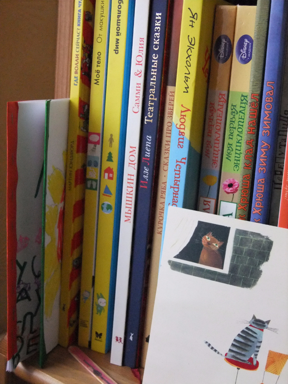 В конце книги, автор. А читает Рада её самостоятельно и каждый раз в новом варианте. Мне прочитала, что это такая странная девочка Мумрик живёт с красивой мамой Мумрей, они вместе любят гулять и играть. А ещё у неё есть подруга, слонёнок Тыц. И вот подруги как-то раз сильно поругались, Тыц обиделась, села в ракету и улетела прямо в Космос.