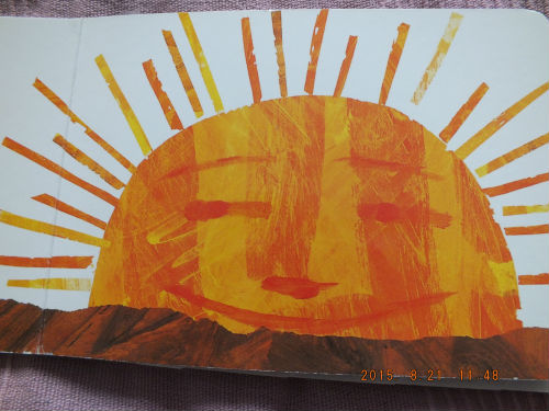 А вот просыпается Семен в оранжевом настроении, так как солнышко с утра очень даже оранжевое) Как в "Голодной гусенице" Э.Карла, вон как солнышко улыбается: