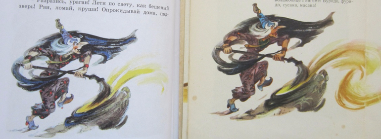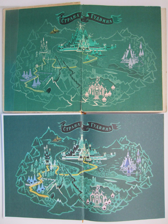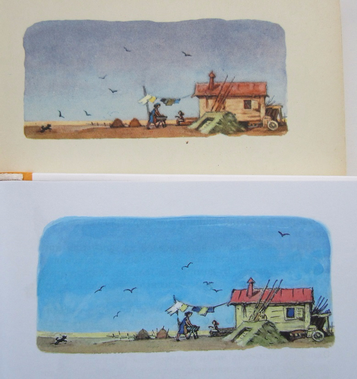 За пролетевшие 53 года книга успели значительно пожелтеть. Но по-моему, в ней изначально было много тёплых оттенков, особенно бросается в глаза коричневый цвет. В новом издании очень много синего: местами смотрится хорошо, местами - явный перебор. И вся цветовая гамма более холодная.