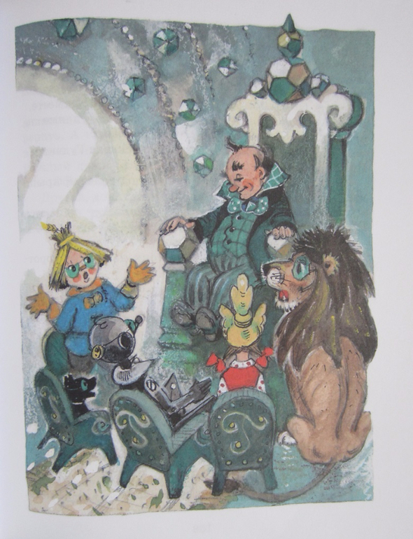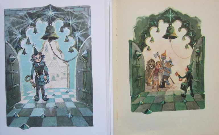 А вот тот самый момент, когда у меня в голове что-то щёлкнуло окончательно. Фарамант встречает друзей у входа в Изумрудный город! Тут и отличия искать не нужно: две разные иллюстрации.